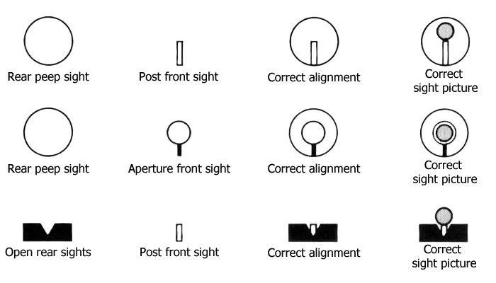 These are relevant for both rifle and pistol shooting using iron sights. If you align your sights so that they provide you with this sight pattern your shots should be centred on target.
