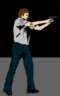 In two handed shooting, an often used stance has the left foot pointing in the direction of the target; the right foot is to the rear, slightly further apart than the width of the shoulder. This is demonstrated in the diagram below. This position is referred to as the Weaver Stance, after an American Deputy Sheriff.